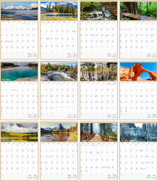 2026 Wall Calendar Spiral-bound Twin-Wire Binding - 12 Months Planner - Large Ruled Blocks with Julian Dates - (National Parks)