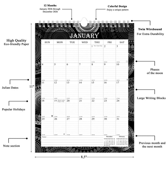 2026 Wall Calendar Spiral-Bound Twin-Wire Binding - 12 Months 010 B&W