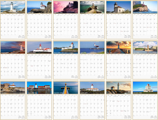 2025 - 2026 Wall Calendar Spiral-bound Twin-Wire Binding - 18 Months Planner - Large Ruled Blocks with Julian Dates - (Lighthouses)