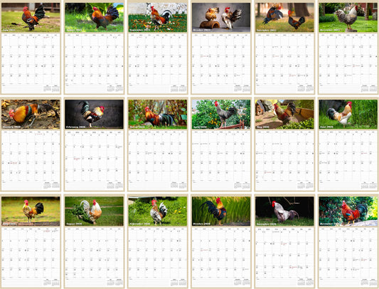 2025 - 2026 Wall Calendar Spiral-bound Twin-Wire Binding - 18 Months Planner - Large Ruled Blocks with Julian Dates - (Roosters)