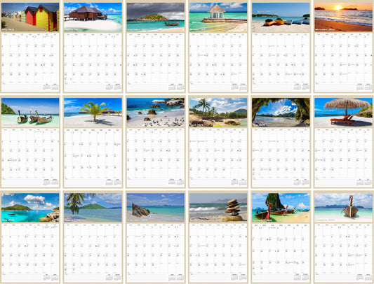 2025 - 2026 Wall Calendar Spiral-bound Twin-Wire Binding - 18 Months Planner - Large Ruled Blocks with Julian Dates - (Beaches)