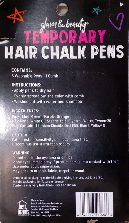 Glam & Beauty Temporary Hair Chalk Pens 5 Colors - Hair Beauty Fun- New