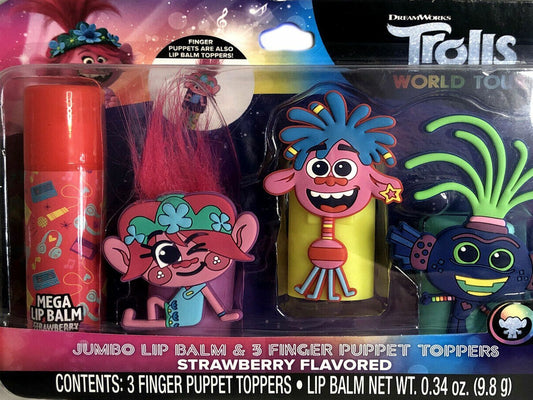 Trolls World Tour Jumbo Lip Balm 3 Finger Puppet Toppers Strawberry & Mango Set