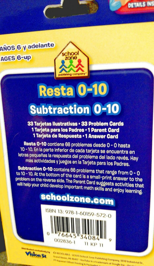 School Zone Bilingual Spanish English Subtraction (Resta) Facts 0-10 Flash Cards