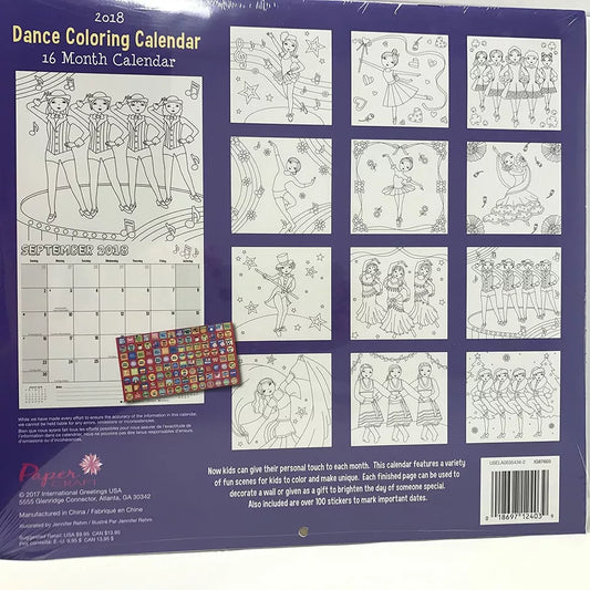 Dance Coloring 16 month 2018 Calendar 11" x 12"