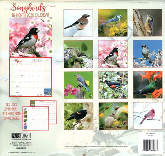 Songbirds - 16 Month 2020 Wall Calendar - with 100 Reminder Stickers