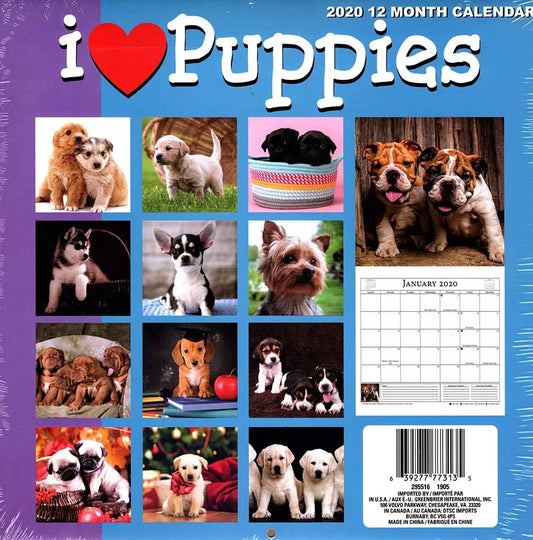 I Love Puppies - 12 Month 2020 Wall Calendar - with 100 Reminder Stickers