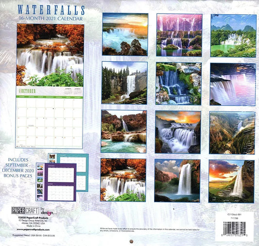 2021 16 Month Wall Calendar - Waterfalls - with 100 Reminder Stickers