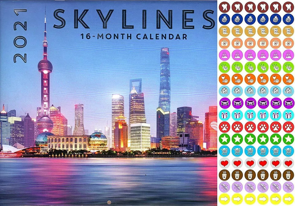 - 2021 16 Month Wall Calendar - Skylines - with 100 Reminder Stickers