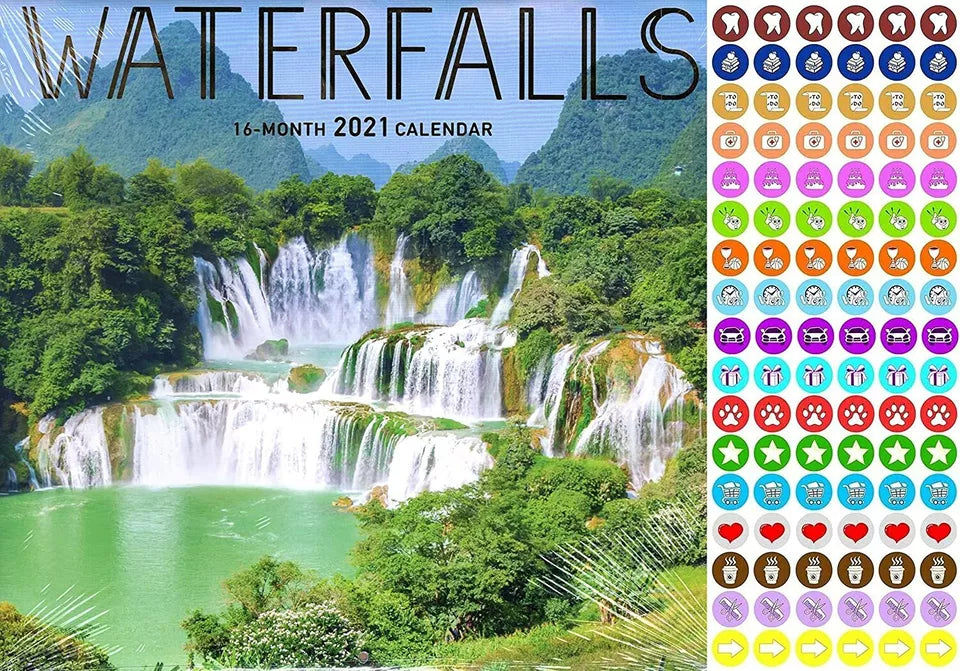 - 2021 16 Month Wall Calendar - Waterfalls - with 100 Reminder Stickers