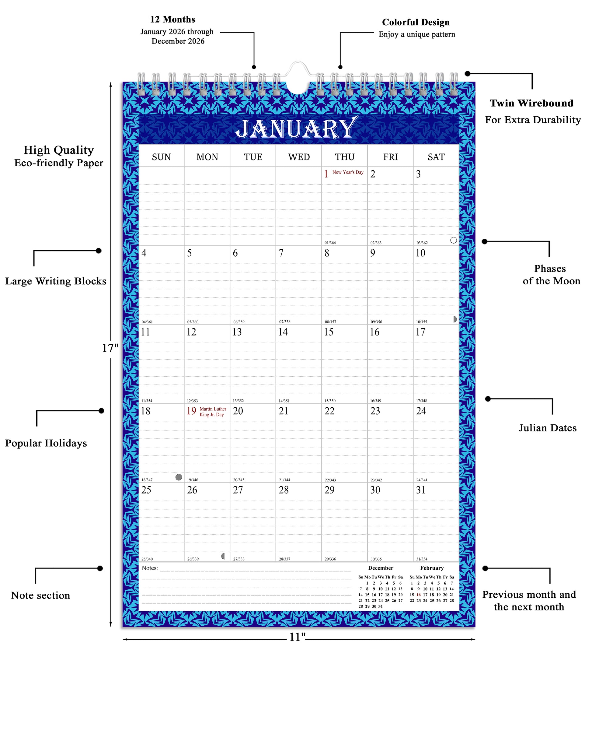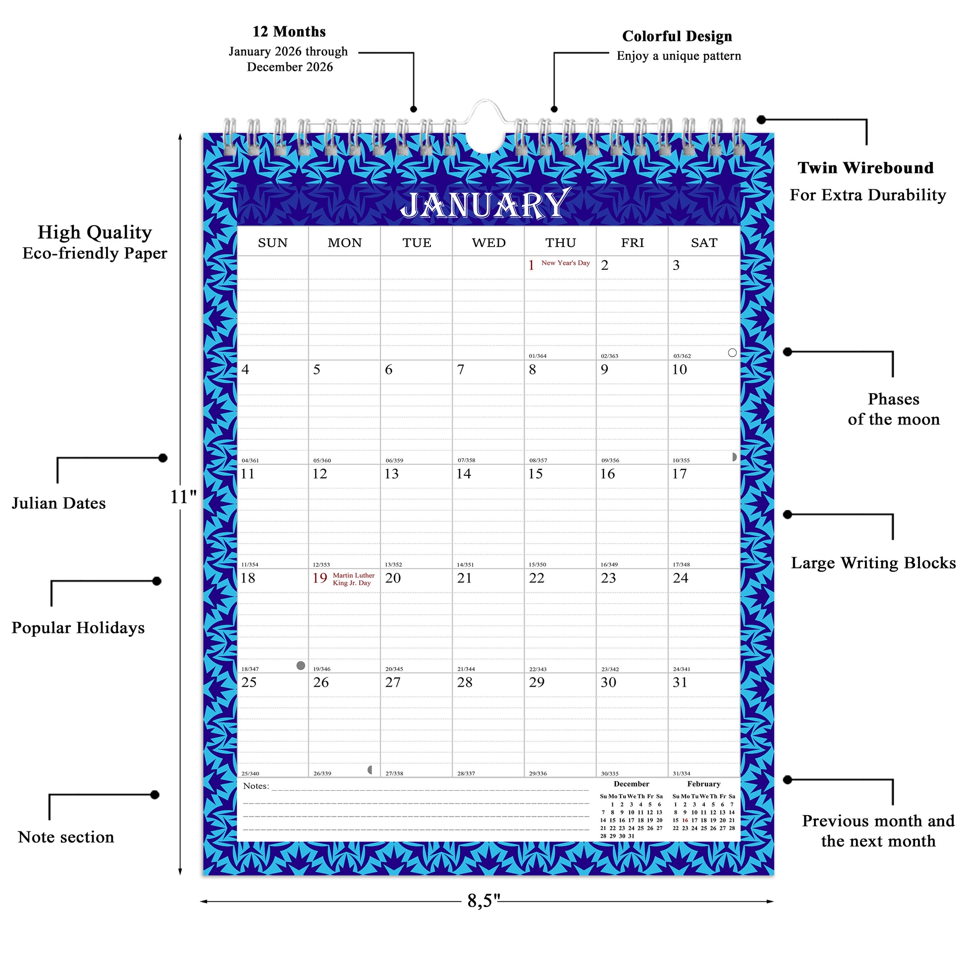 - JANUARY 2026 - DECEMBER 2026 - The 2026 wall calendar features 12 months of monthly pages, focus on easy and efficient planning, scheduling and tracking for a manageable and successful life. Keep up with appointments, meetings and events with this 2026 Monthly Calendar. The calendar Measures approximately 8.5 inches by 5.5 inches (8.5 x 11 Inches) Inches or The calendar Measures approximately 11 inches by 8.5 inches (11 x 17)