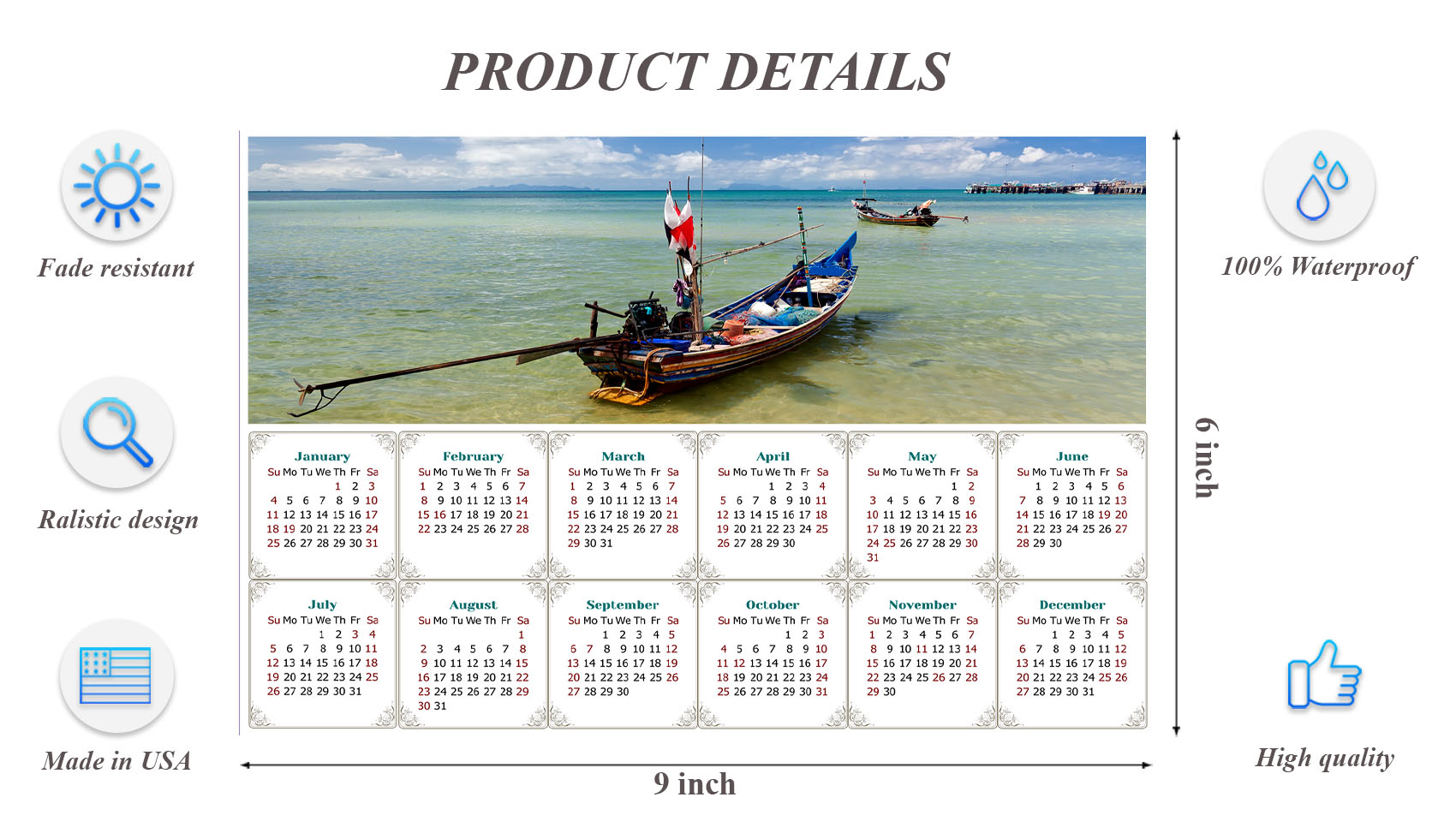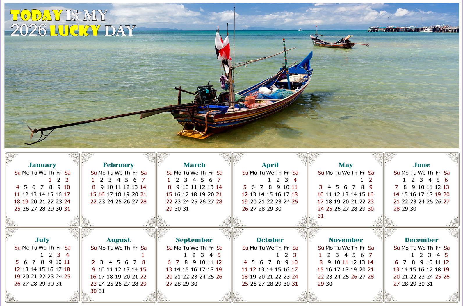 2026 Peel & Stick Calendar - Today is my Lucky Day - Removable - Thai Boat on a Beach (9"x 6")