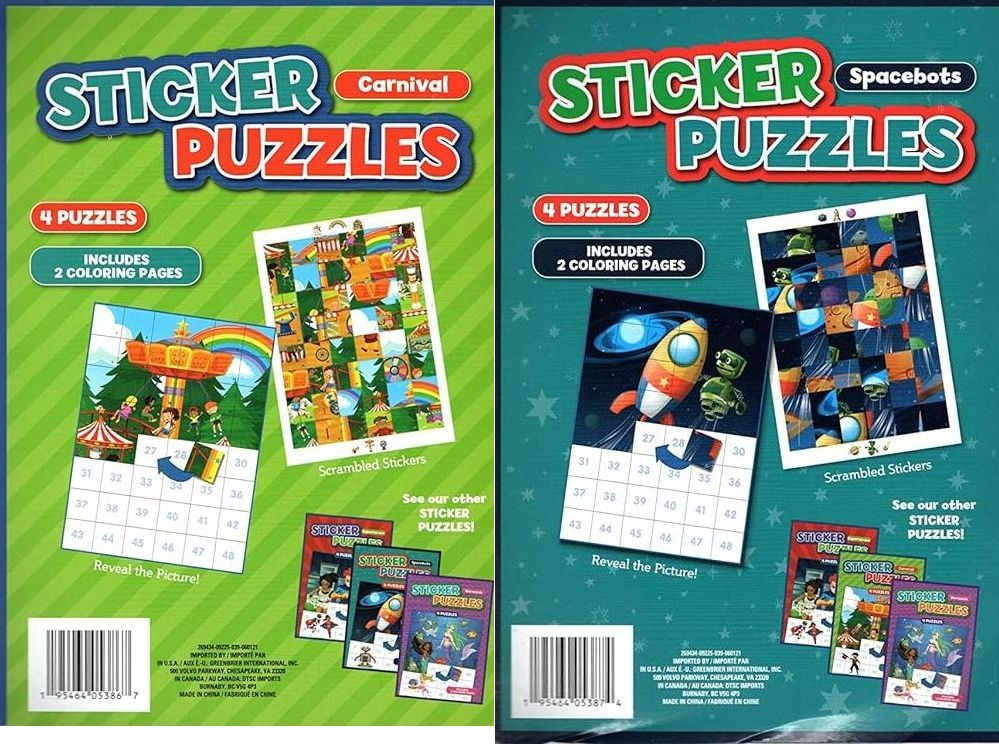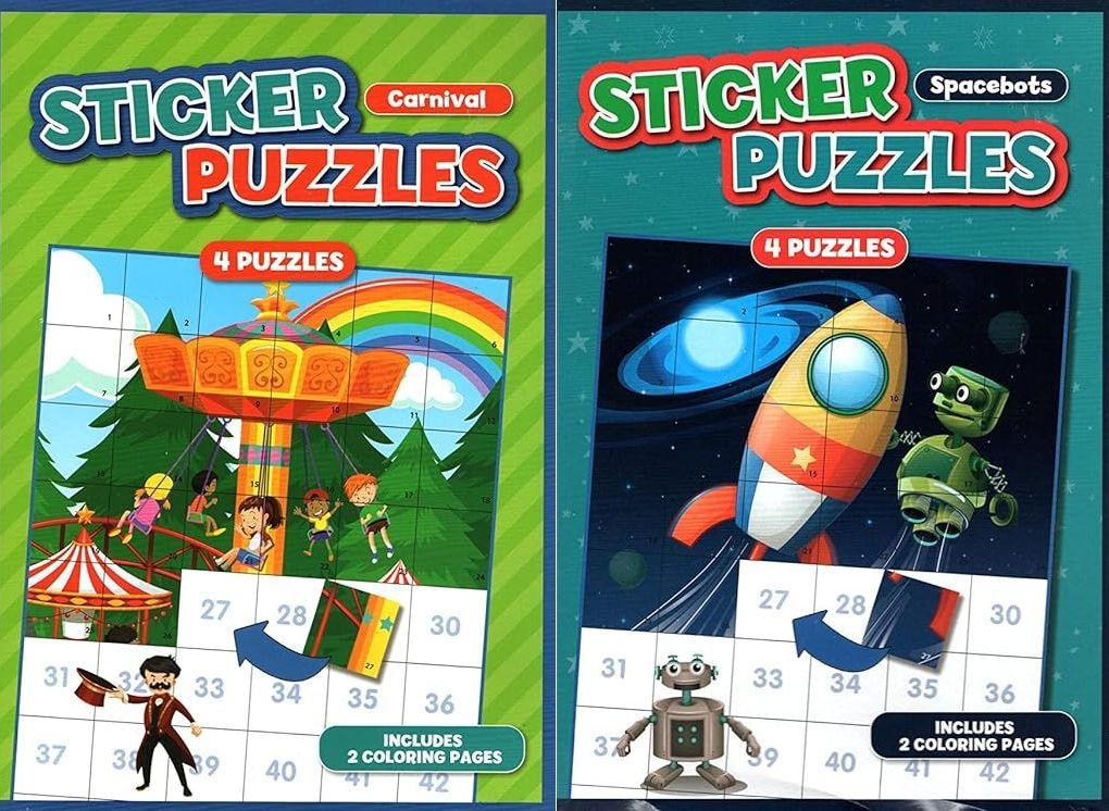 - 2 Sticker Puzzle titles: Mermaids, Spacebots. Each book has sticker puzzles and coloring pages.