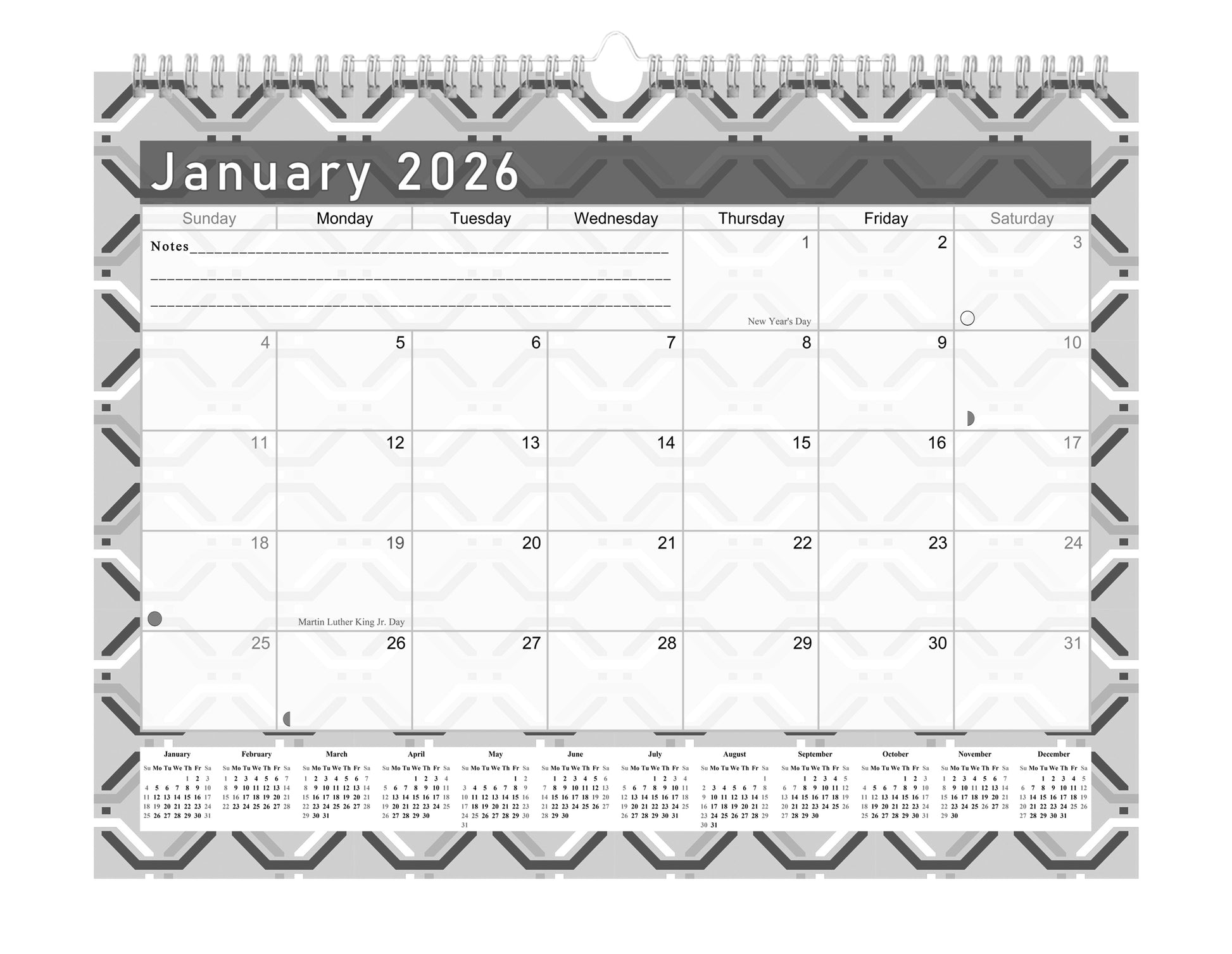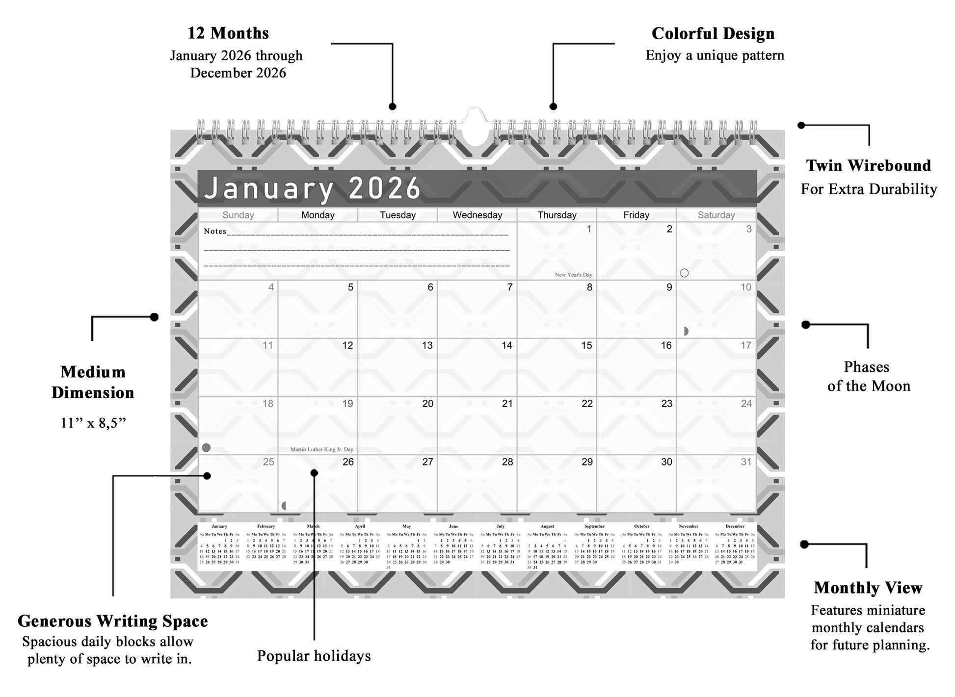 2025-2026 Monthly Spiral-Bound Wall/Desk Calendar - Desktop/Wall Blotter Calendar/Planner - (Edition Geometric B&W #04)