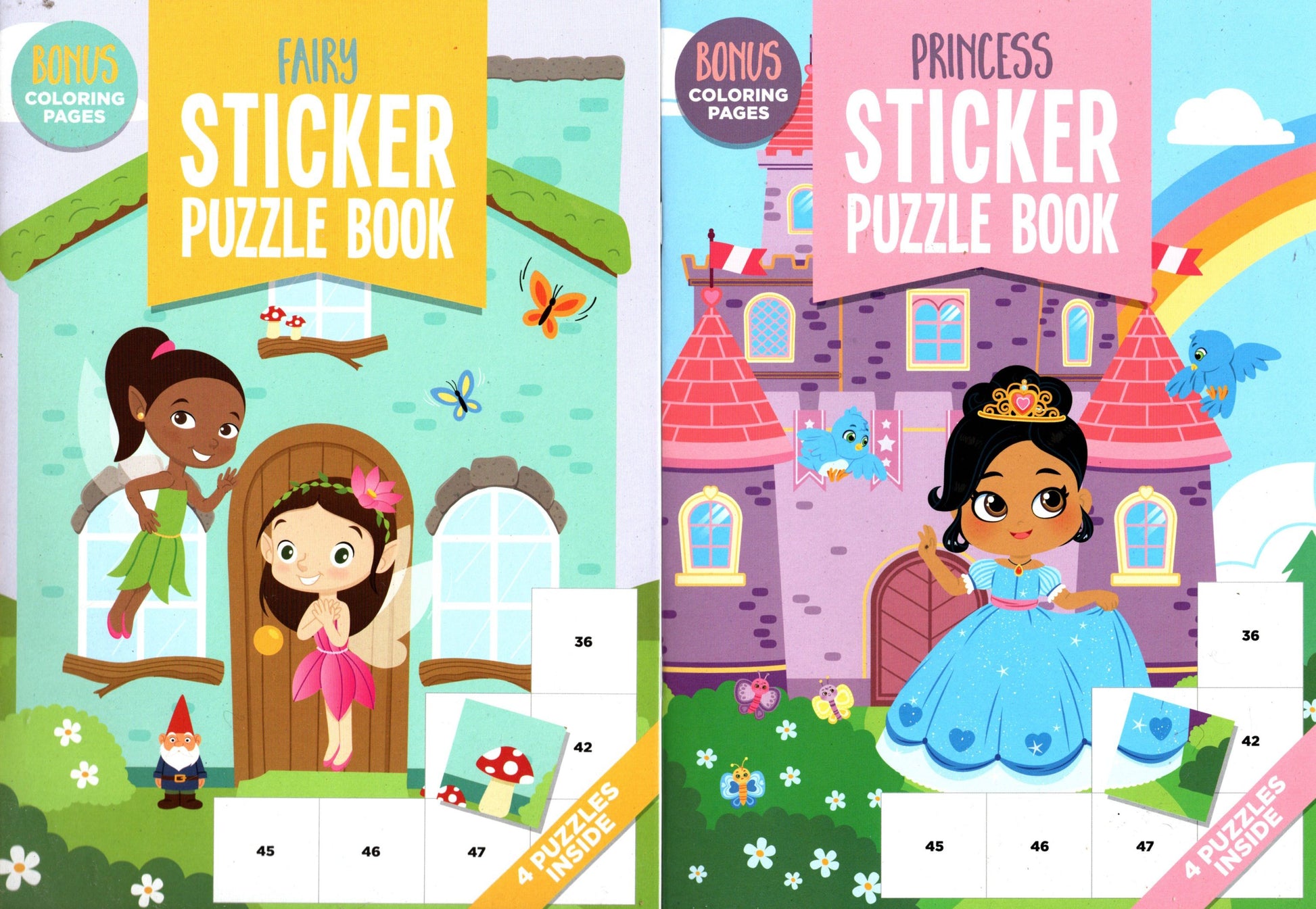 - 2 Sticker Puzzle titles: Fairy & Princess. Each book has sticker puzzles and coloring pages.