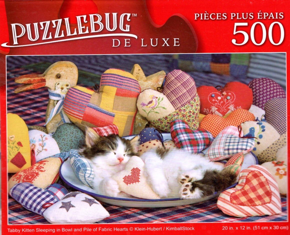 Tabby Kitten Sleeping in Bowl and Pile Fabric Hearts - 500 Pieces Deluxe Jigsaw Puzzle
