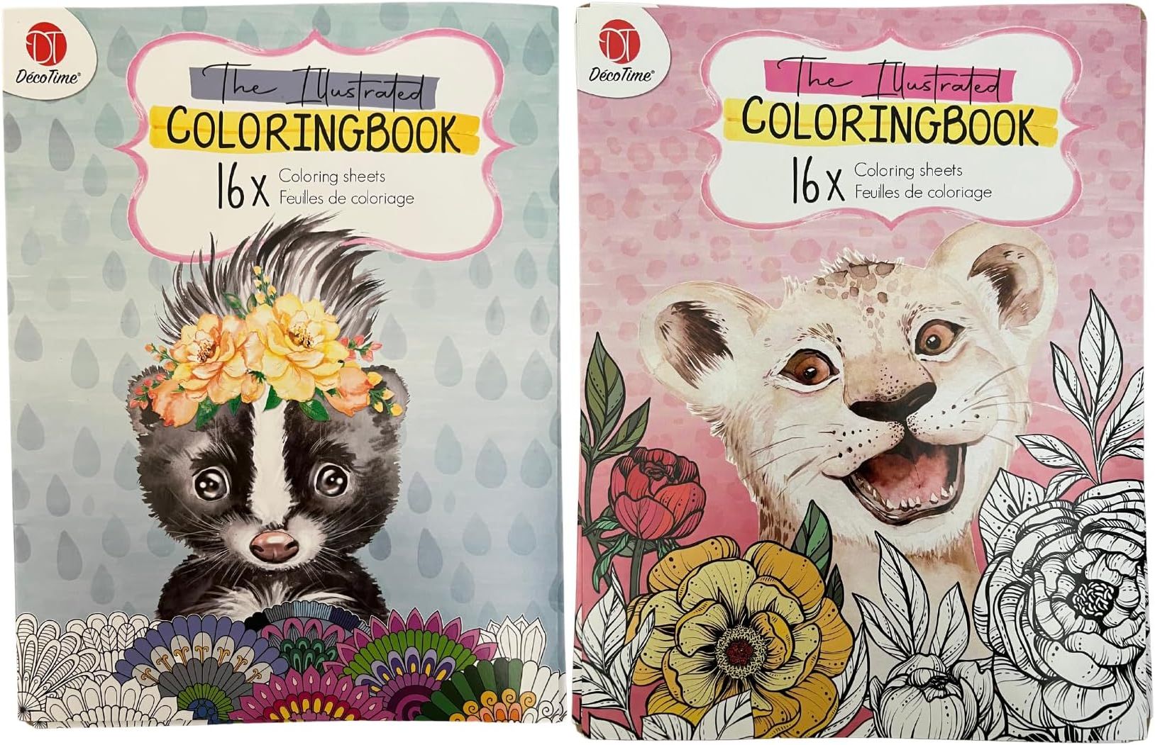 The Illustrated Coloring Book, 16 Sheets - Blue Skunk & Pink Lion (Set of 2 Books)